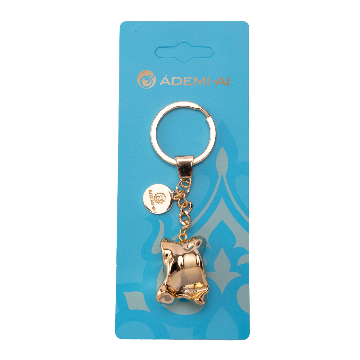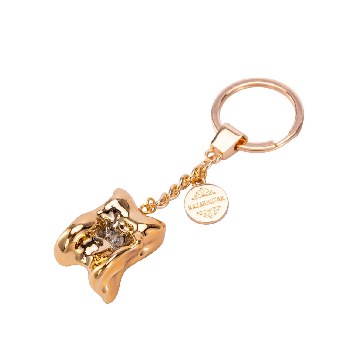 Декоративный брелок в форме традиционной казахской кости асық, символа удачи, силы и благополучия. Изделие выполнено с декоративным покрытием под золото, предназначено для использования в качестве аксессуара для ключей или памятного сувенира.