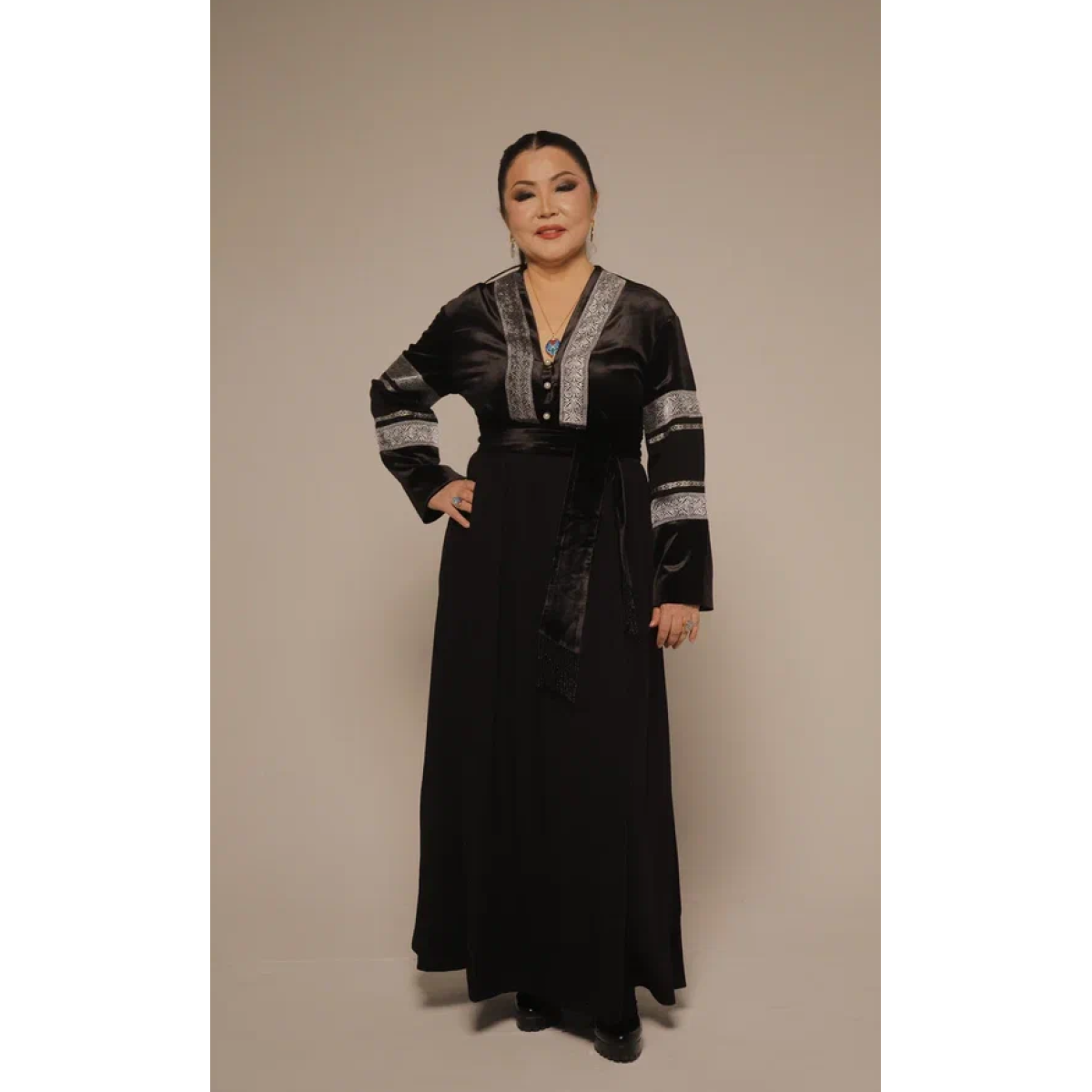 Коллекция объединяет традиционные силуэты и современное прочтение казахского стиля. Модель подходит для женщин любого возраста — она одинаково элегантно смотрится как на молодой девушке, так и на зрелой женщине.