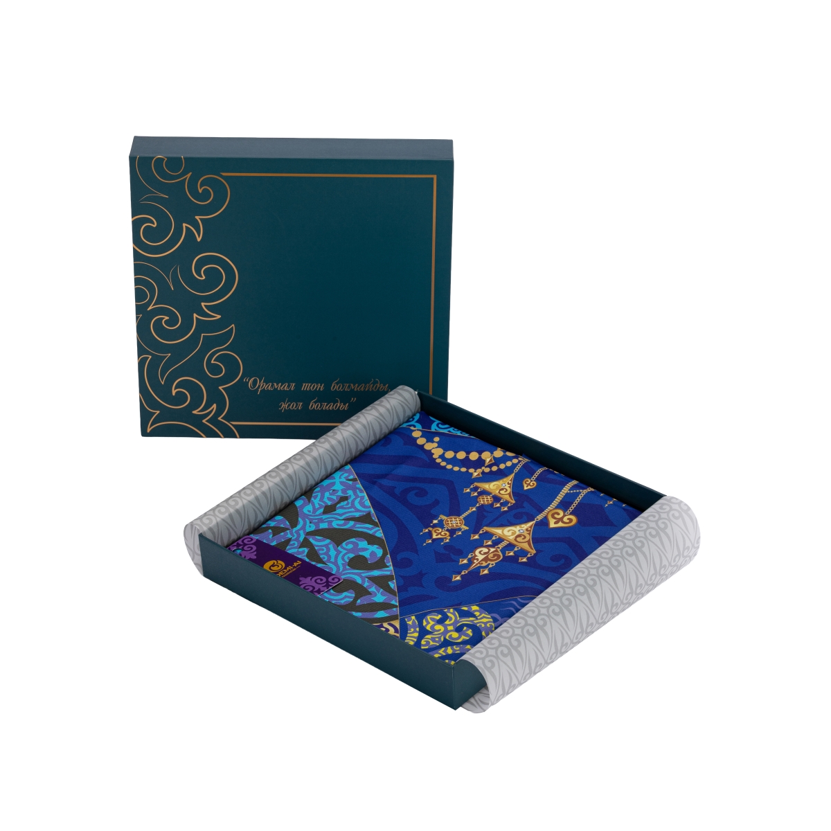 «Жанар» — это гармония традиционных узоров и утончённой женственности. Каждый фрагмент платка украшен казахским орнаментом, отражающим богатство культуры, внутреннюю красоту и символику единства. Сочетание различных мотивов в одной композиции создаёт образ вдохновения и глубины.