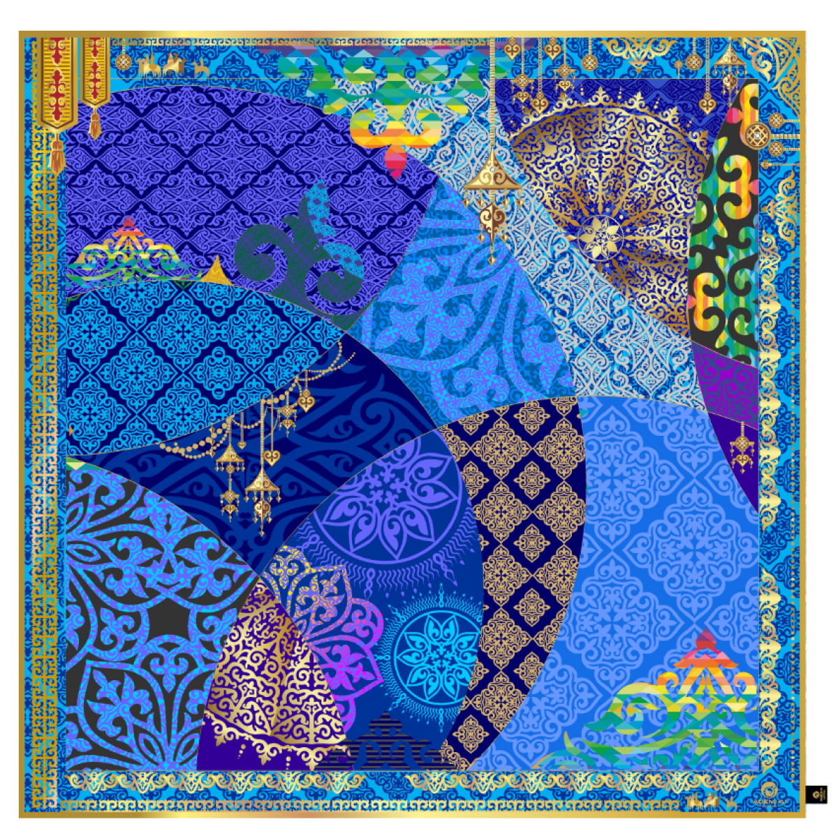 «Жанар» — это гармония традиционных узоров и утончённой женственности. Каждый фрагмент платка украшен казахским орнаментом, отражающим богатство культуры, внутреннюю красоту и символику единства. Сочетание различных мотивов в одной композиции создаёт образ вдохновения и глубины.