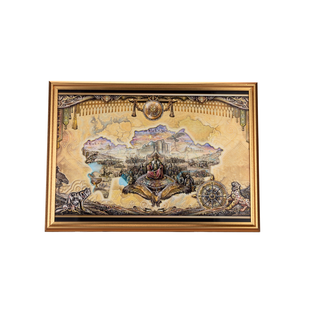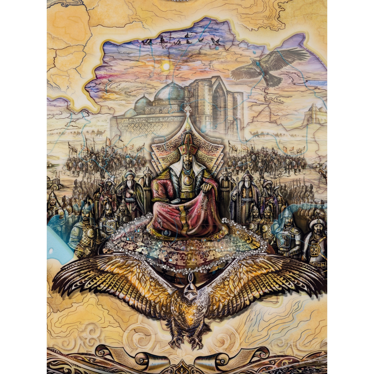 В центре — символ единства и власти, вокруг которого изображена жизнь народа: древние города, караваны, сцены традиционного быта. Парящий орёл олицетворяет свободу и стремление к высоте, а образы животных и национальные орнаменты подчеркивают силу природы и богатство культурного кода.