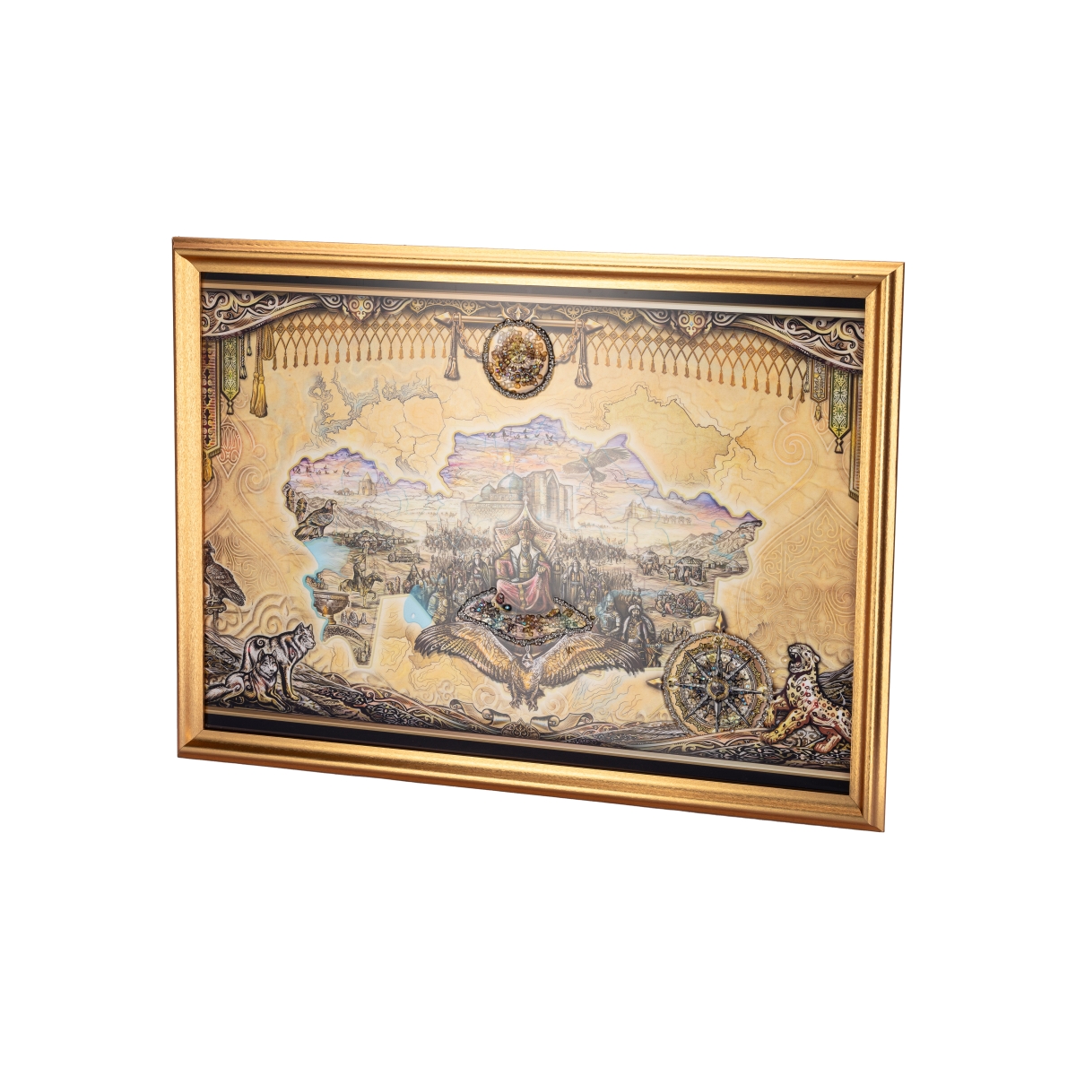 Это произведение — художественное отражение глубокой истории и духовной сущности казахской земли. В картине объединены широта степи, наследие предков и корни нации, представленные в единой, продуманной композиции. На фоне карты Казахстана раскрывается кочевая культура, дух свободы, связь человека и природы.